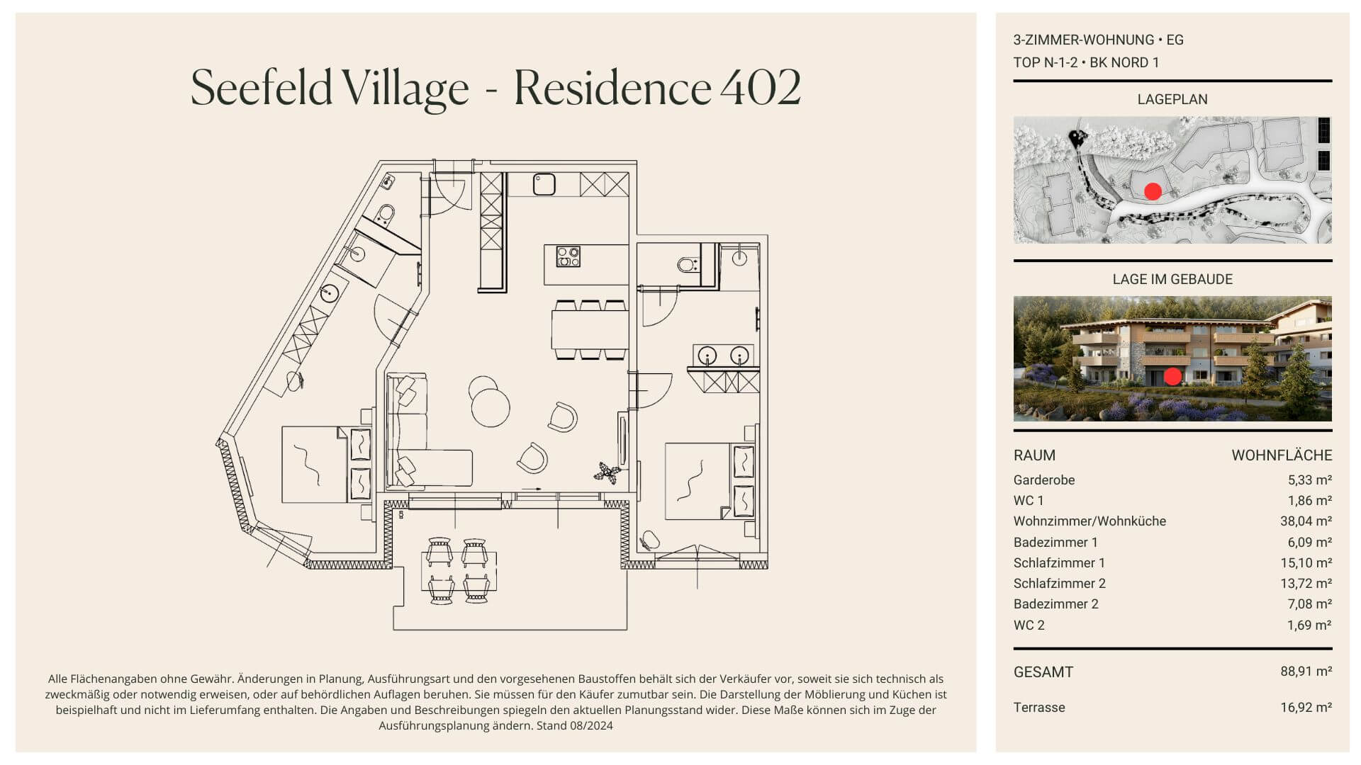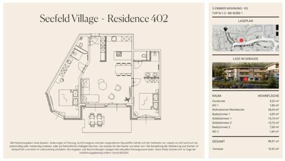 De residences liggen direct aan het bergwater, dat door het centrum van het dorp stroomt. U kunt uw auto parkeren op uw eigen parkeerplaats in de ondergrondse parkeergarage, die via een trap of lift direct verbonden is met de luxe en comfortabele residences. Alle residences hebben een balkon of terras met een fantastisch uitzicht.